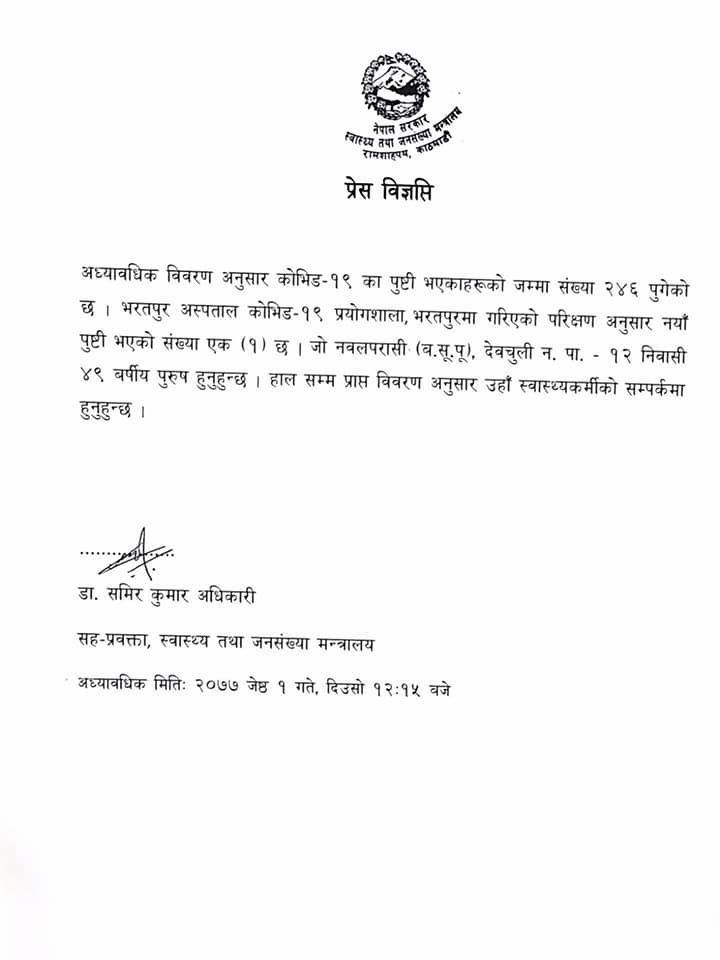 यससँगै नेपालभर कोरोना संक्रमितहरुको संख्या २४६ पुगेको छ । यसअघि मन्त्रालयले २५० जना सार्वजनिक गरेपनि प्राविधिक कारण पुरानै रिपोर्टिङ हुन गएको भन्दै सच्याएको छ ।