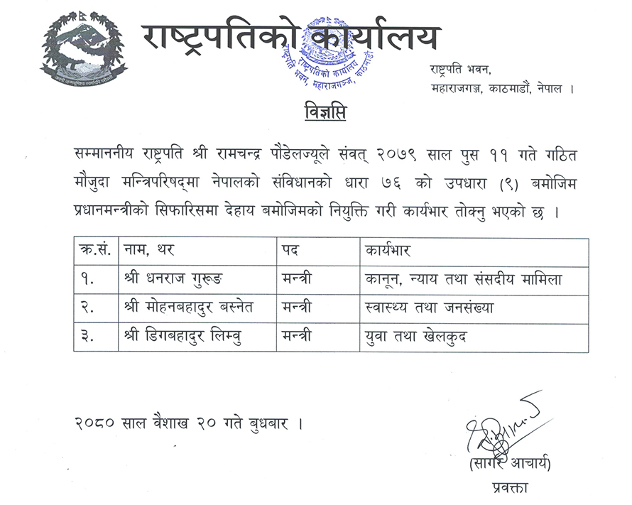 नेपाली कांग्रेसका उपसभापति धनराज गुरुङ कानुन, न्याय तथा संसदीय मामिला, मोहनबहादुर बस्नेत स्वास्थ्य तथा जनसंख्या र डिगबहादुर लिम्बु युवा तथा खेलकुदमन्त्रीमा नियुक्त भएका हुन् ।