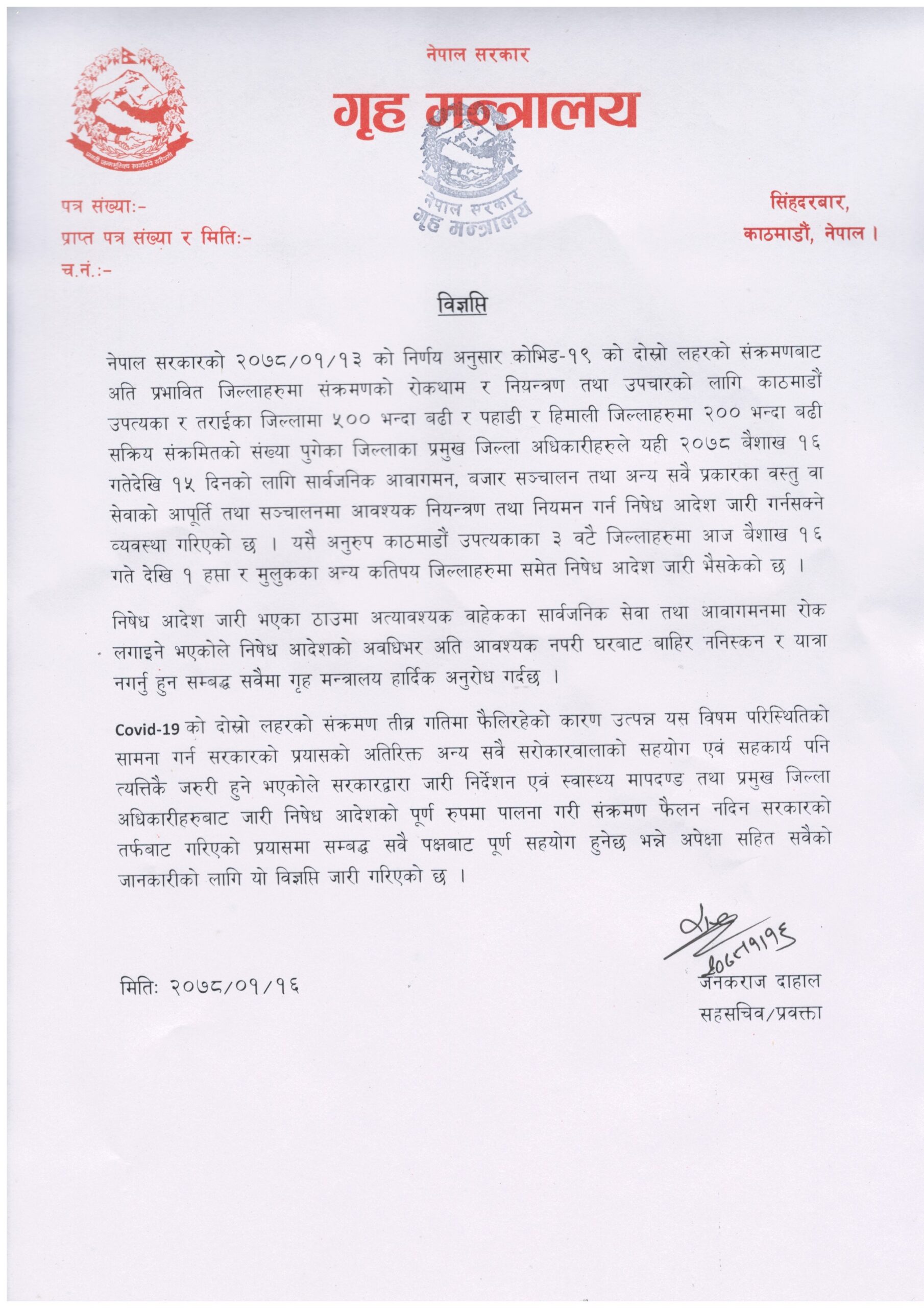 सोही अनुरुप वैशाख १६ गतेदेखि काठमाडौँ उपत्यका लगायतका कोरोना भाइरसबाट अति प्रभावित जिल्लाहरुमा निषेधाज्ञा जारी गरिएको छ ।