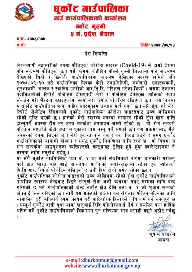 पोखरेलले विज्ञप्तिमा आफू गाउँपालिका बाहिर सदरमुकाम तम्घासमा मात्र गएको भन्दै यति हुँदाहुँदै आफ्नो रिपोर्ट पोजेटिभ देखिएकाले धुर्कोट कोरोनाको उच्च जोखिममा रहेको पुष्टि भएको उल्लेख गरेका छन् ।