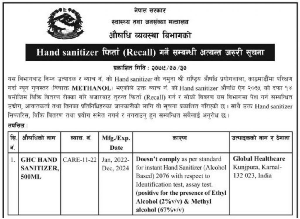 विभागले भारतीय कम्पनि ग्लोबल हेल्थ केयरले उत्पादन गरेको जिएचसी ह्यान्ड स्यानिटाइजर ५०० एम.एल.को विक्रि–वितरण रोक्का गरी बजारबाट तत्काल फिर्ता गर्न निर्देशन दिएको हो ।