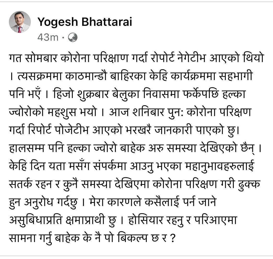 गत सोमबार कोरोना परीक्षण गर्दा रिपोर्ट नेगेटिभ आएको थियो, त्यसक्रममा काठमाडौँ बाहिरका केहि कार्यक्रमहरुमा सहभागी पनि भएँ, हिँजो शुक्रबार बेलुका निवासमा फर्किएपछि हल्का ज्वरोको महसुस भयो, भट्टराईले लेखेका छन् ‘आज शनिबार पुनःपरीक्षण गर्दा रिपोर्ट पोजिटिभ आएको जानकारी पाएको छु ।’
